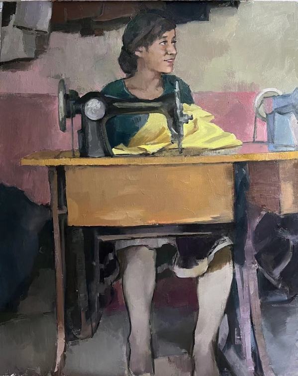 罗闻文 油画《踩缝纫机的维族姑娘》 100cm×80cm