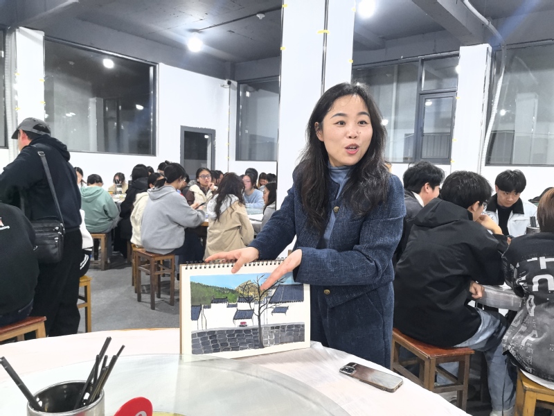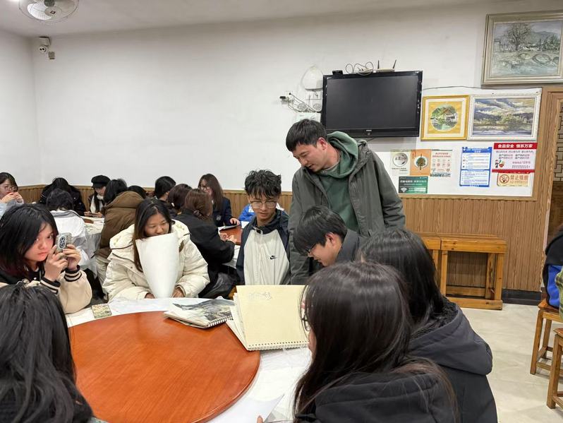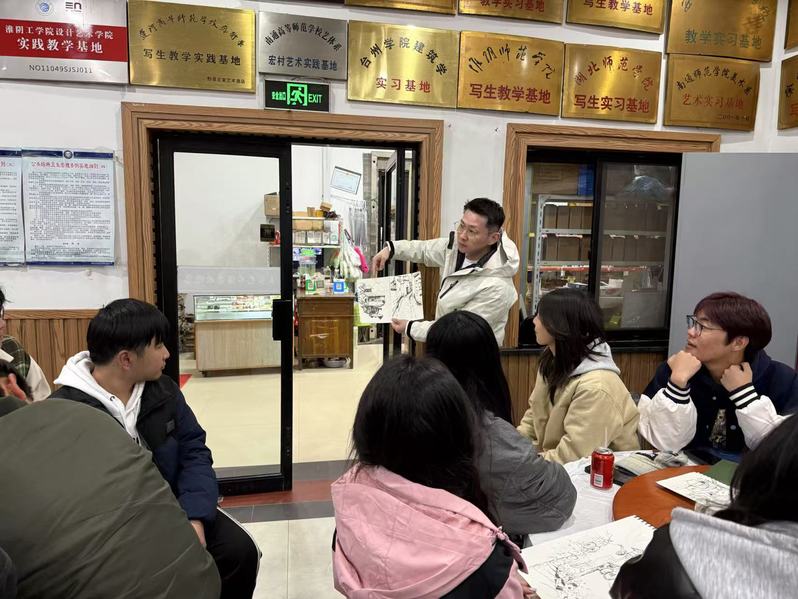 白天,老师带领员工行走在安徽的画里水乡――宏村、南屏、秀里、卢村,师生用画笔记录着皖南的自然风光与人文景观;晚上,指导老师在基地组织大家分组进行习作观摩和点评,师生有效互动,气氛热烈,达到了预期的教学效果。美术教育24(青)班主任高广毅介绍:课程设置强调“观察—提炼—表现”闭环,并邀请基地负责人景道秀开展徽州文化讲解,帮助员工从文化根脉中汲取灵感。