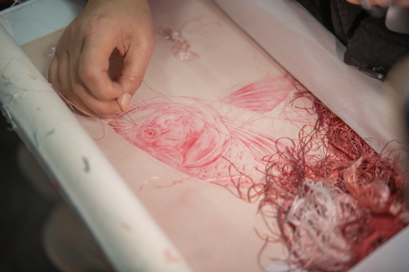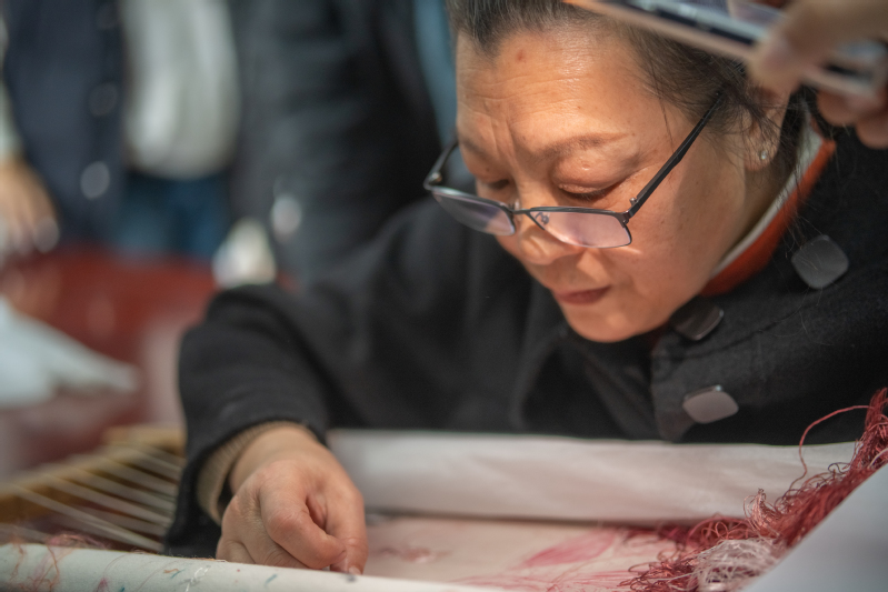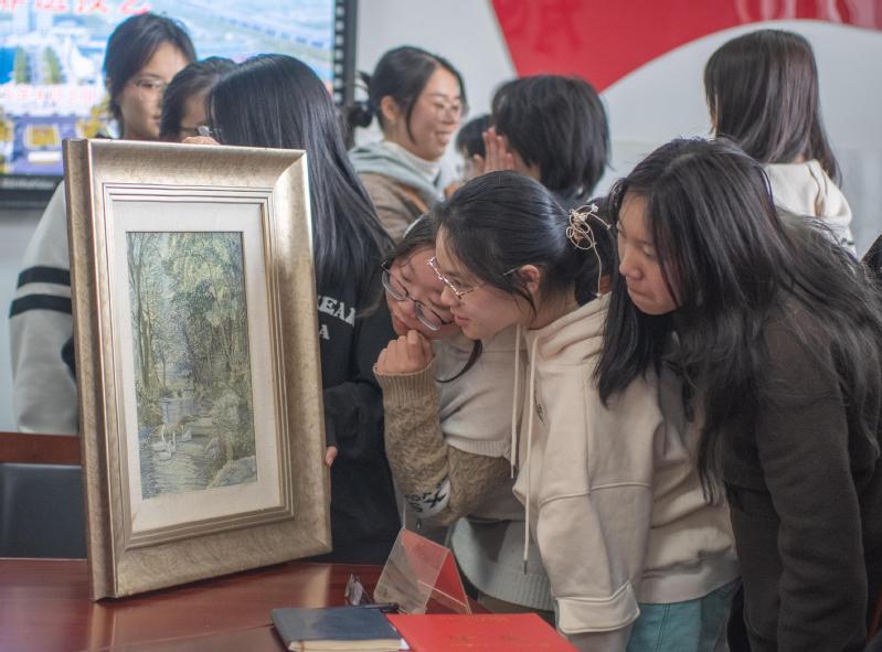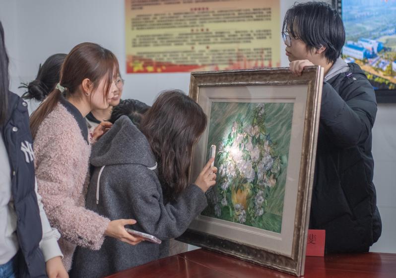 周教授的绣品熠熠生辉,展现了现代工艺的精湛绝伦。员工或凑近端详针法运用,或静静伫立欣赏,感受彩锦绣与沈绣的微妙区别之处。各色丝线在各自指间缠绕,同学们无不为其精细程度所震撼。