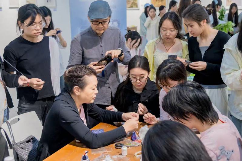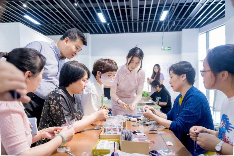 江苏省产业教授、南通彩锦绣传承人周芬老师亲临授艺,刺子绣的飞针走线令古老纹样在当代焕发光华。参与者更将刺绣技法与香囊创作相融,诞生出兼具装饰之美与实用之效的特色绣品,传统技艺的创造性传承在此刻生动演绎。