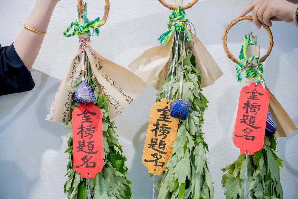巧手飞针处,非遗魅力触手可及。师生们穿引彩线、填充香草,素朴土布在指尖幻化为玲珑粽形香囊与饱满葫芦绣品——一针一线,缝入的是驱邪纳福的千年祈愿,更是对传统女红技艺的沉浸体悟。艾草菖蒲束上,手书楷隶行草的小挂件随风轻舞,笔墨风骨与传统草木清香交织,门挂方寸间尽显吉祥寓意与手作温情。