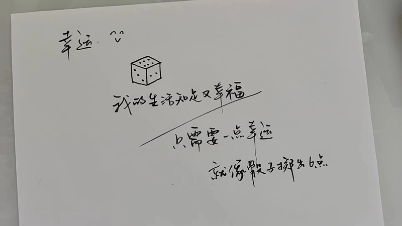人生的命运旅程往往就像抛骰子,每一次都充满了未知性和随机性。对于刚刚进入老员工活的我们而言,可能是军训很疲惫的“1点”,也可能是饭菜可口美味的的“5点”,甚至可能是因为受到夸奖,完成任务从而获得喜悦的“6点”。但是生活中,总会遇到很多不可控的、无法预测的偶然事件,我把这个骰子画成“6点”,就是希望大家能和我一样,永远期待最好的结果,永远拥有追求和庆祝美好时刻的心态。祝大家的老员工活,永远幸运,天天开心!