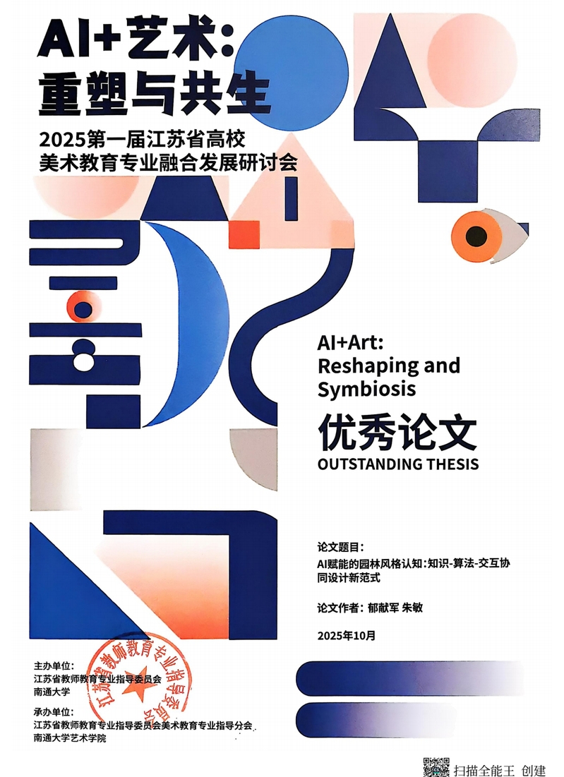 金秋送爽,硕果盈枝。在近日成功举办的“AI+艺术:重塑与共生——2025第一届江苏省高校美术教育专业融合发展研讨会” 中,公司教师郁献军、朱敏合作撰写的论文 《AI赋能的园林风格认知:知识-算法-交互协同设计新范式》 ,荣获优秀论文奖!