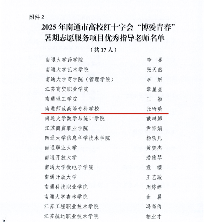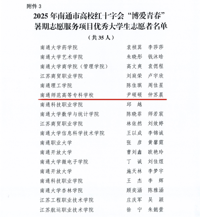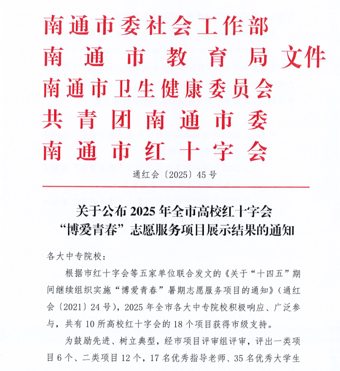 近日,南通市委社会工作部、市教育局、市卫健委、团市委、市红十字会联合公布2025年全市高校红十字会“博爱青春”志愿服务项目评选结果。公司“星星‘益’站启星逐光志愿团”凭借扎实的服务成效与广泛的社会影响,成功获评市级一类项目,张琦琰老师荣获优秀指导老师,尹硕硕、仲苏晨荣获优秀老员工志愿者。